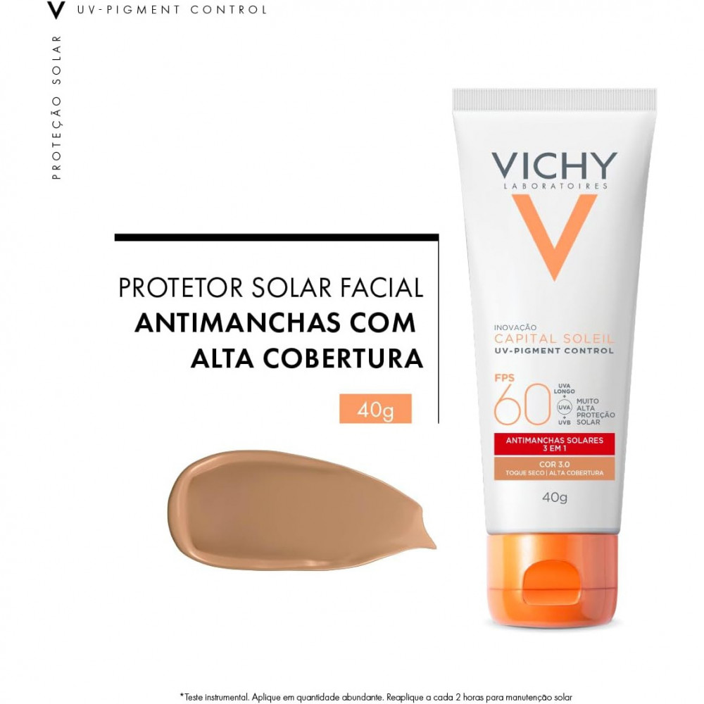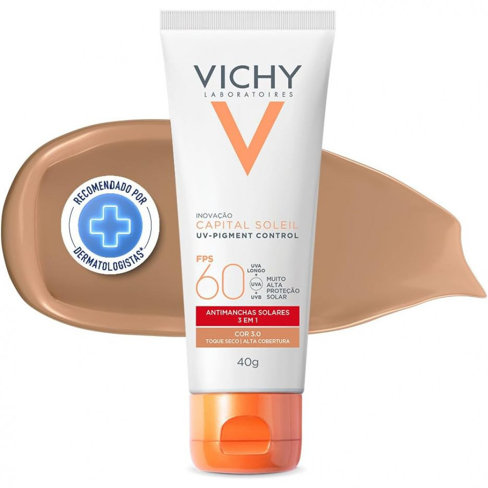 Capital Soleil UV-Pigment Control 40g de Vichy é um protetor solar anti manchas solares com alta cobertura. Fotoproteção diária avançada contra os efeitos dos raios UVA e UVB, redução de manchas solares, prevenção de hiperpigmentação e uniformização da pele com alta cobertura. Textura gel creme com toque seco