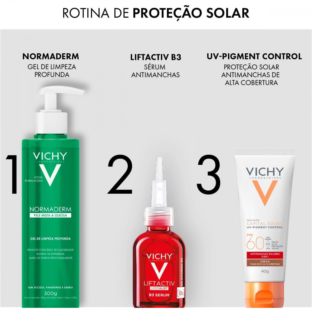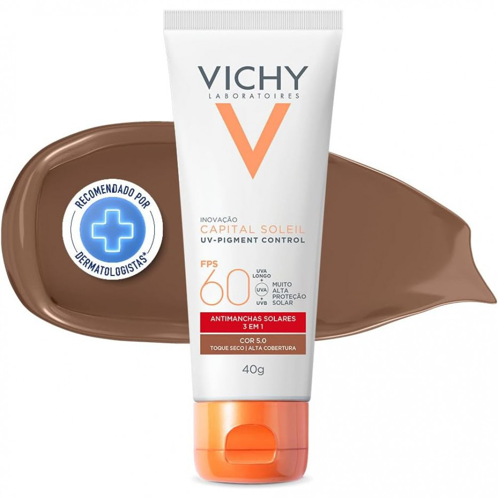 Capital Soleil UV-Pigment Control 40g de Vichy é um protetor solar anti manchas solares com alta cobertura. Fotoproteção diária avançada contra os efeitos dos raios UVA e UVB, redução de manchas solares, prevenção de hiperpigmentação e uniformização da pele com alta cobertura. Textura gel creme com toque seco
