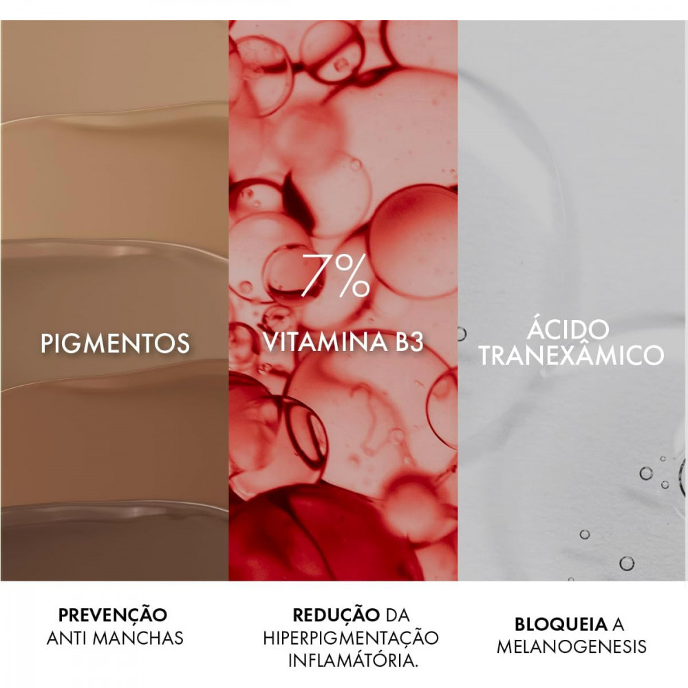 Protege dos raios UVA e UVB; 7% de vitamina B3; Ácido Tranêxamico; pigmentos em alta concentração; fotoproteção diária avançada; redução de manchas solares e uniformização com alta cobertura