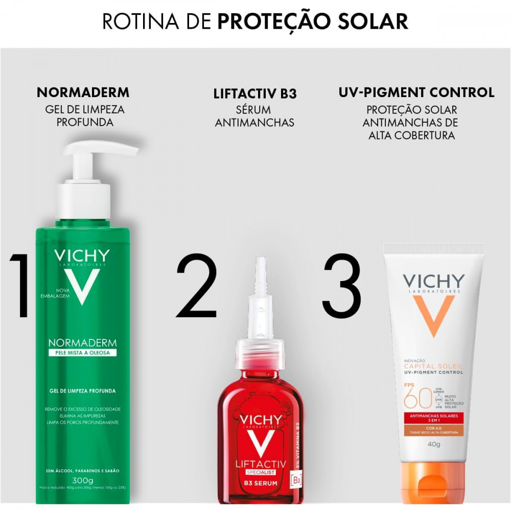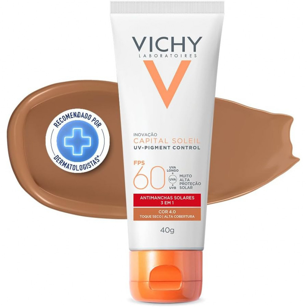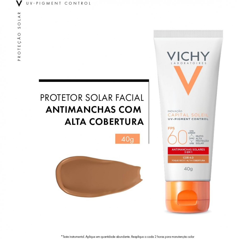 Capital Soleil UV-Pigment Control 40g de Vichy é um protetor solar anti manchas solares com alta cobertura. Fotoproteção diária avançada contra os efeitos dos raios UVA e UVB, redução de manchas solares, prevenção de hiperpigmentação e uniformização da pele com alta cobertura. Textura gel creme com toque seco