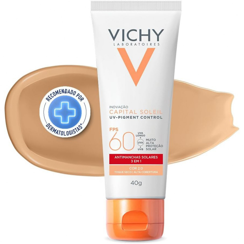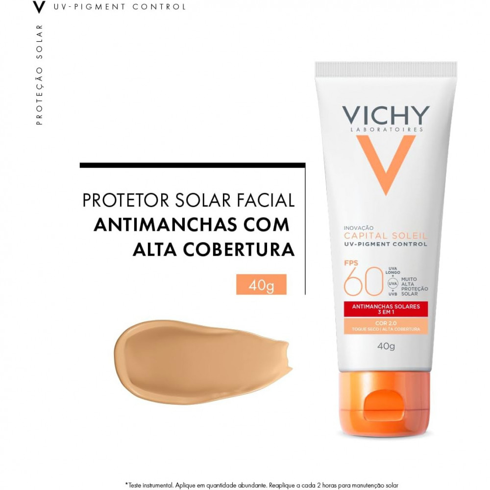 Capital Soleil UV-Pigment Control 40g de Vichy é um protetor solar anti manchas solares com alta cobertura. Fotoproteção diária avançada contra os efeitos dos raios UVA e UVB, redução de manchas solares, prevenção de hiperpigmentação e uniformização da pele com alta cobertura. Textura gel creme com toque seco